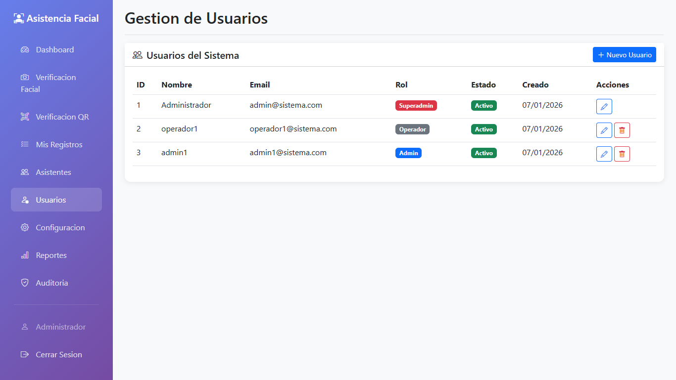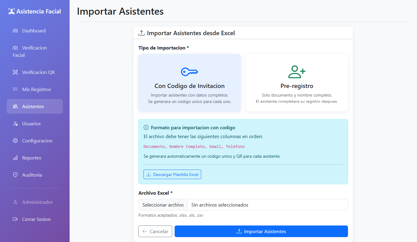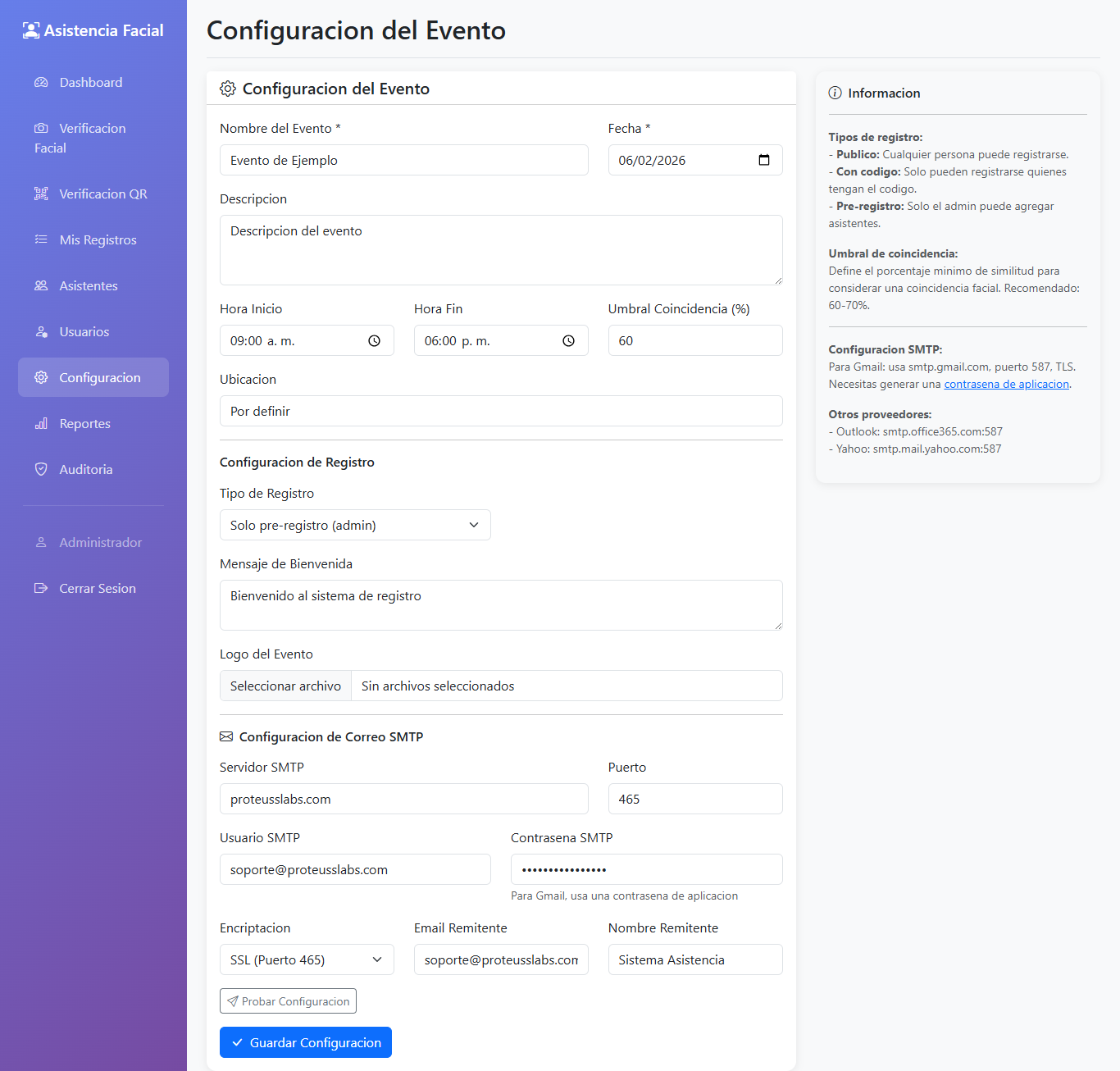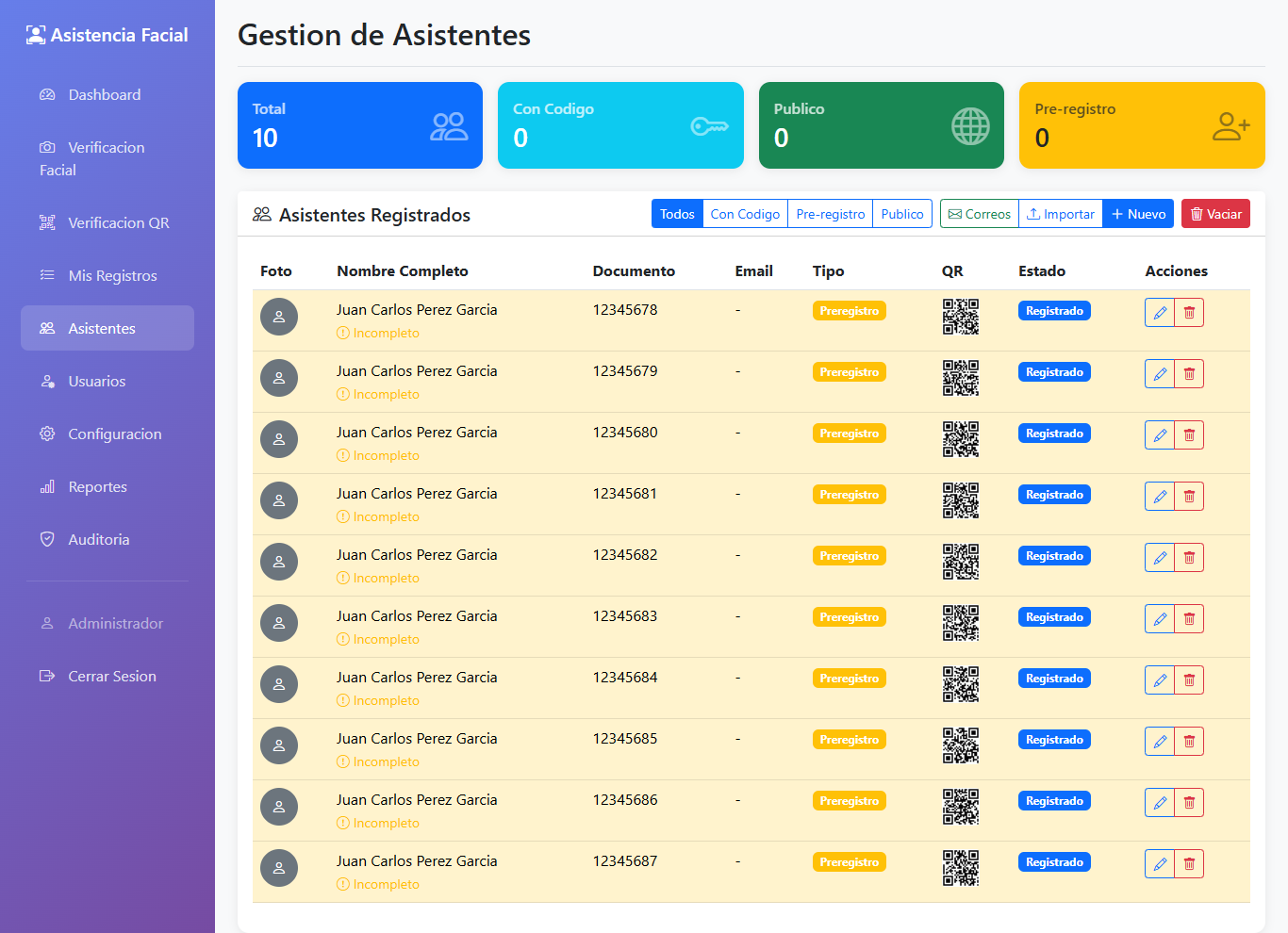 Este sistema de control de asistencia permite verificar la identidad de cada participante en tiempo real mediante reconocimiento facial o código QR. Ideal para eventos empresariales, instituciones educativas y conferencias donde necesitas garantizar que la persona presente sea la misma que se registró.
