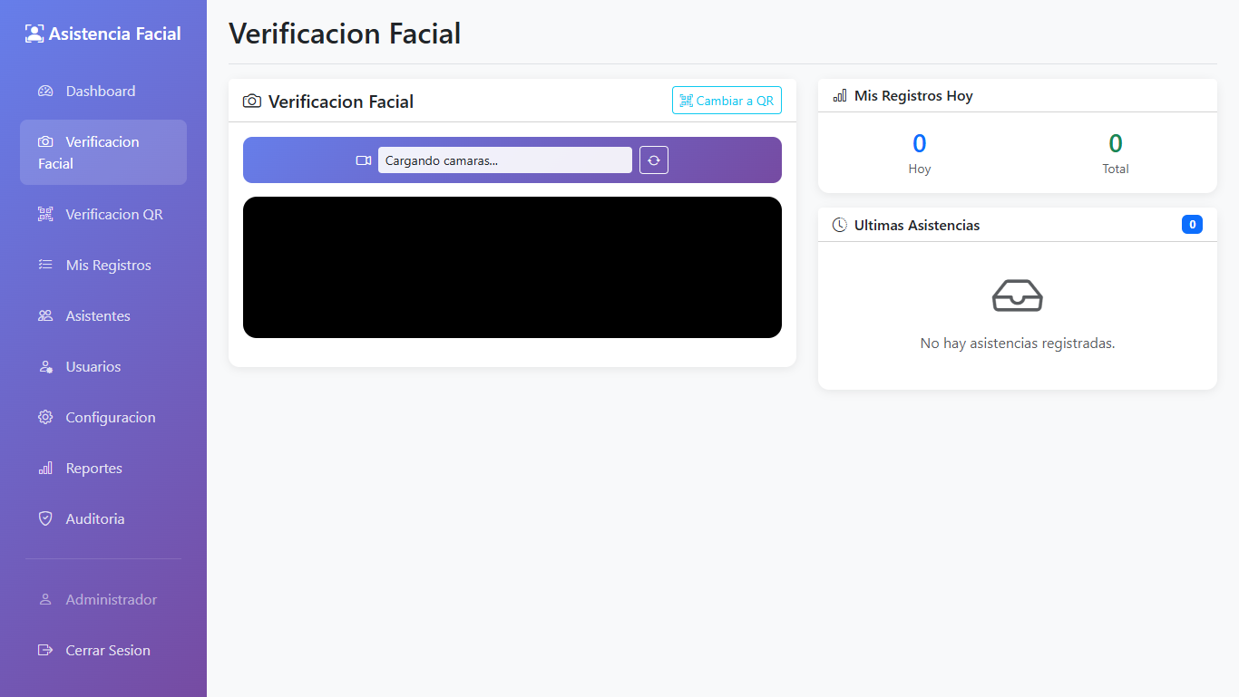 Sistema de asistencia inteligente que utiliza reconocimiento facial en tiempo real y lectura de códigos QR. Identifica rostros registrados o escanea un QR para registrar la asistencia de forma rápida, segura y sin contacto. Tú eliges el método que mejor se adapte a tu evento o institución.