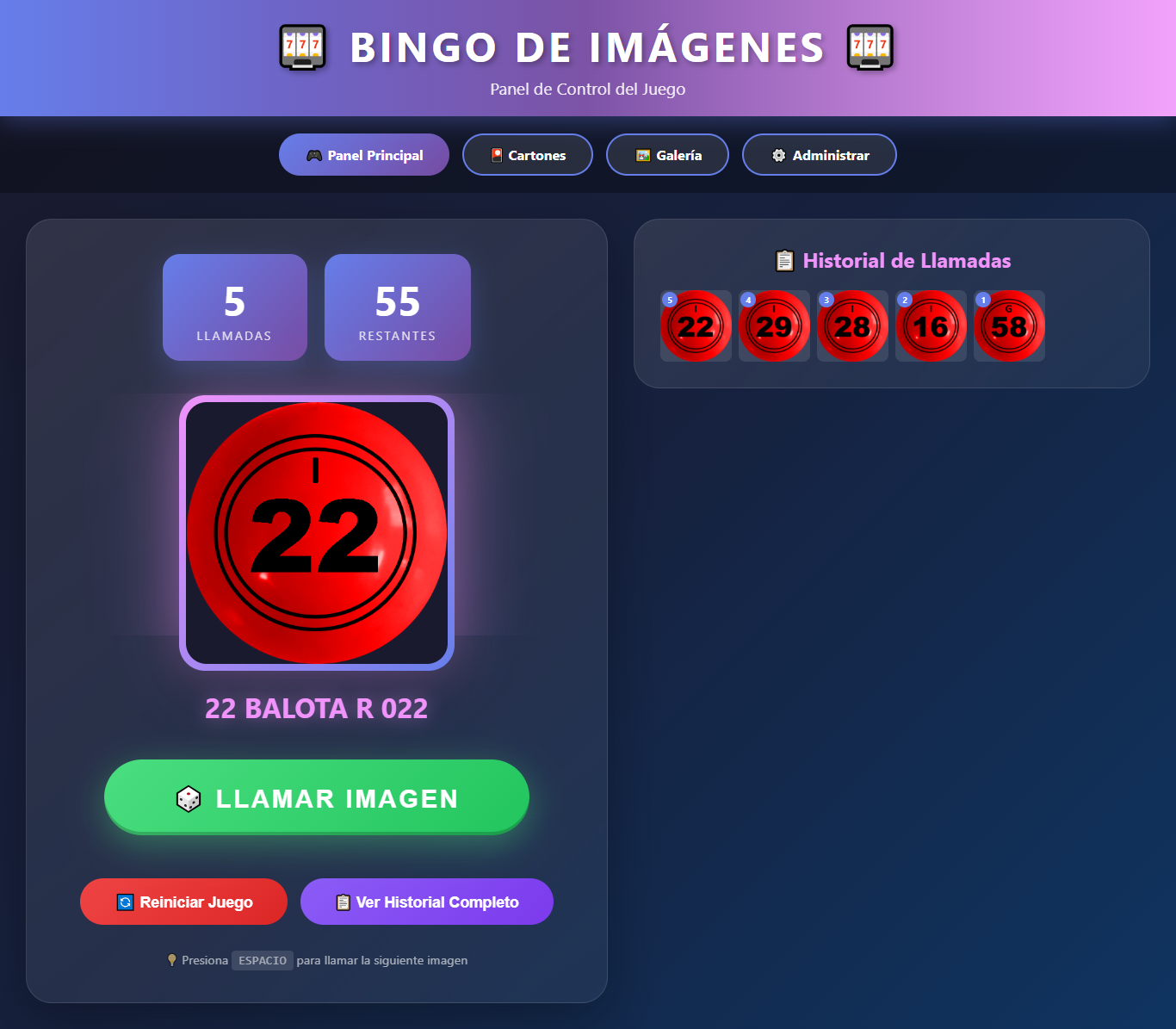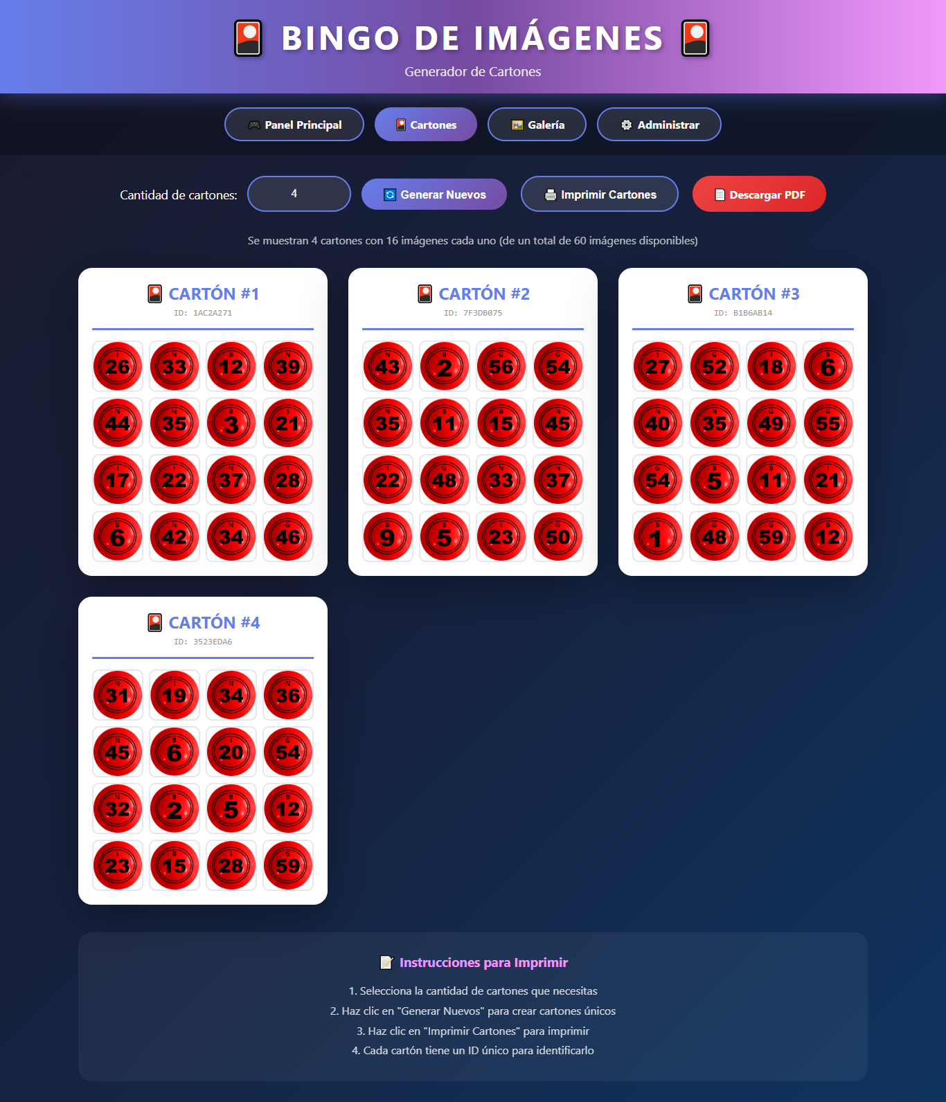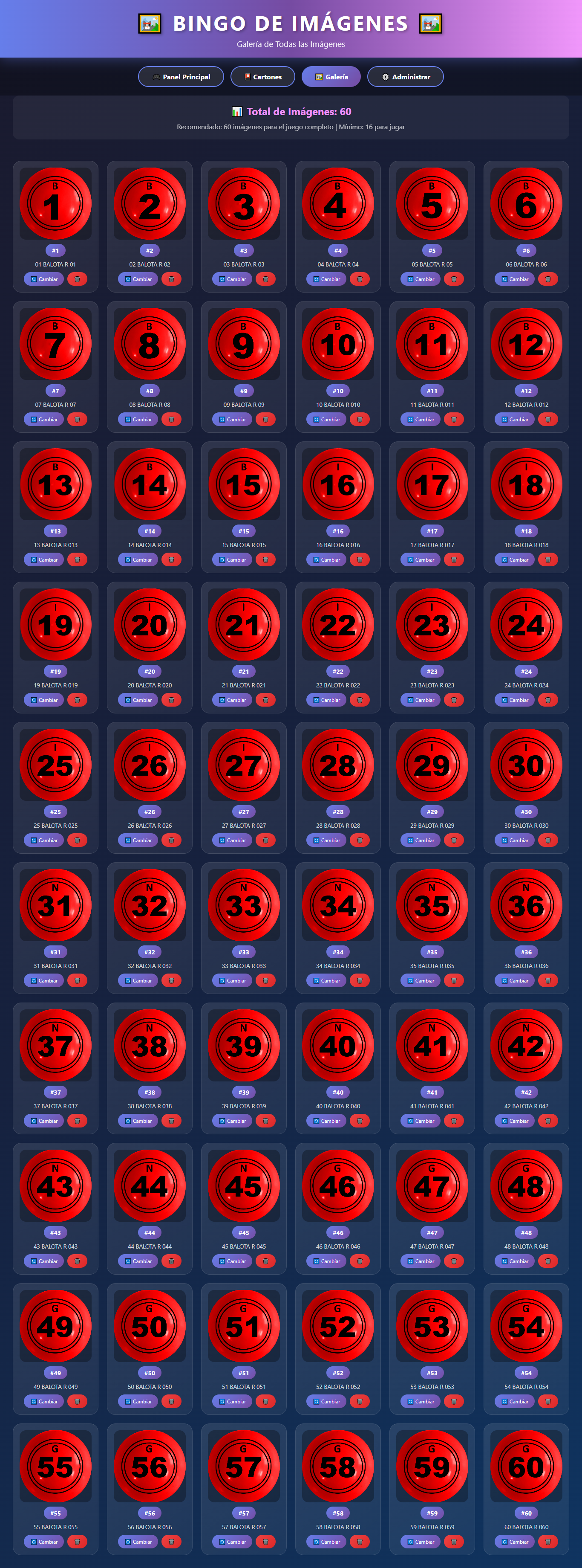 El sistema te permite jugar bingo con 60 imágenes que puedes personalizar, para jugar con tu propias imágenes, dichas imágenes deben estar comprimidas para un mejor rendimiento.